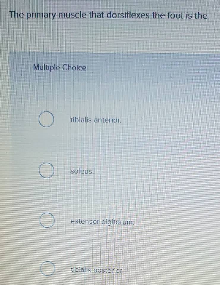 Solved: The primary muscle that dorsiflexes the foot is the Multiple ...