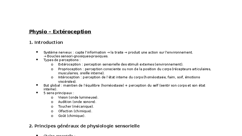 Cours de Physiologie de l'Extéroception et Cognition - Studocu