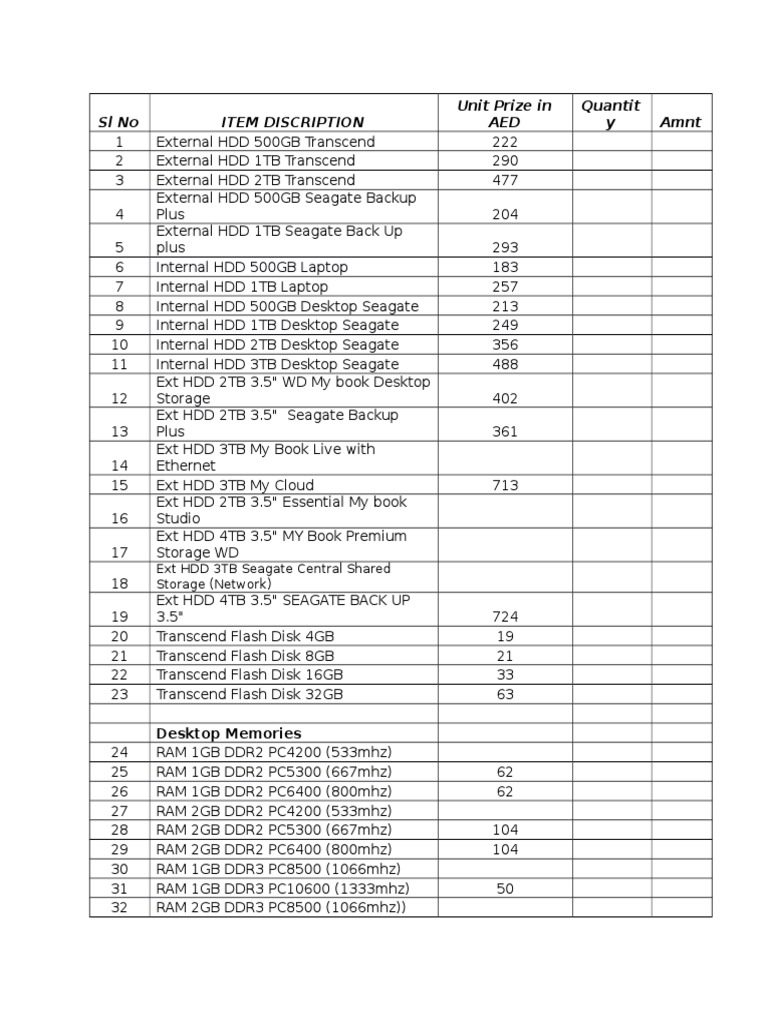 SL No Item Discription Unit Prize in AED Quantit y Amnt: Ext HDD 3TB ...