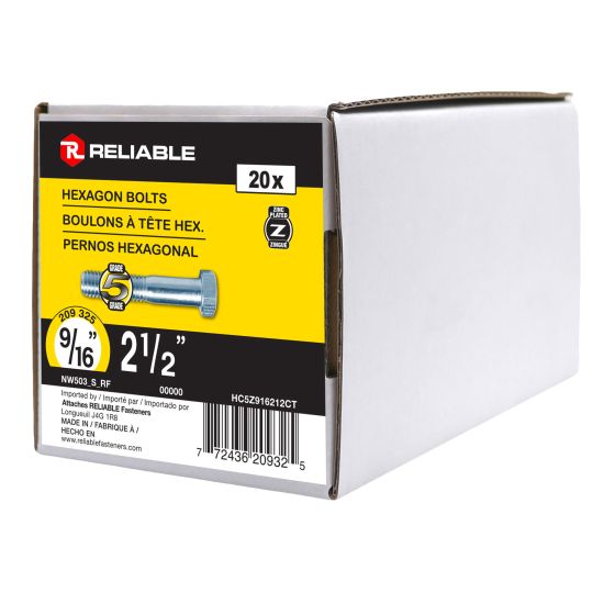 Hex Bolt - Grade 5 - Zinc Plated - 9/16" x 4.5" - 20-Pack from RELIABLE ...
