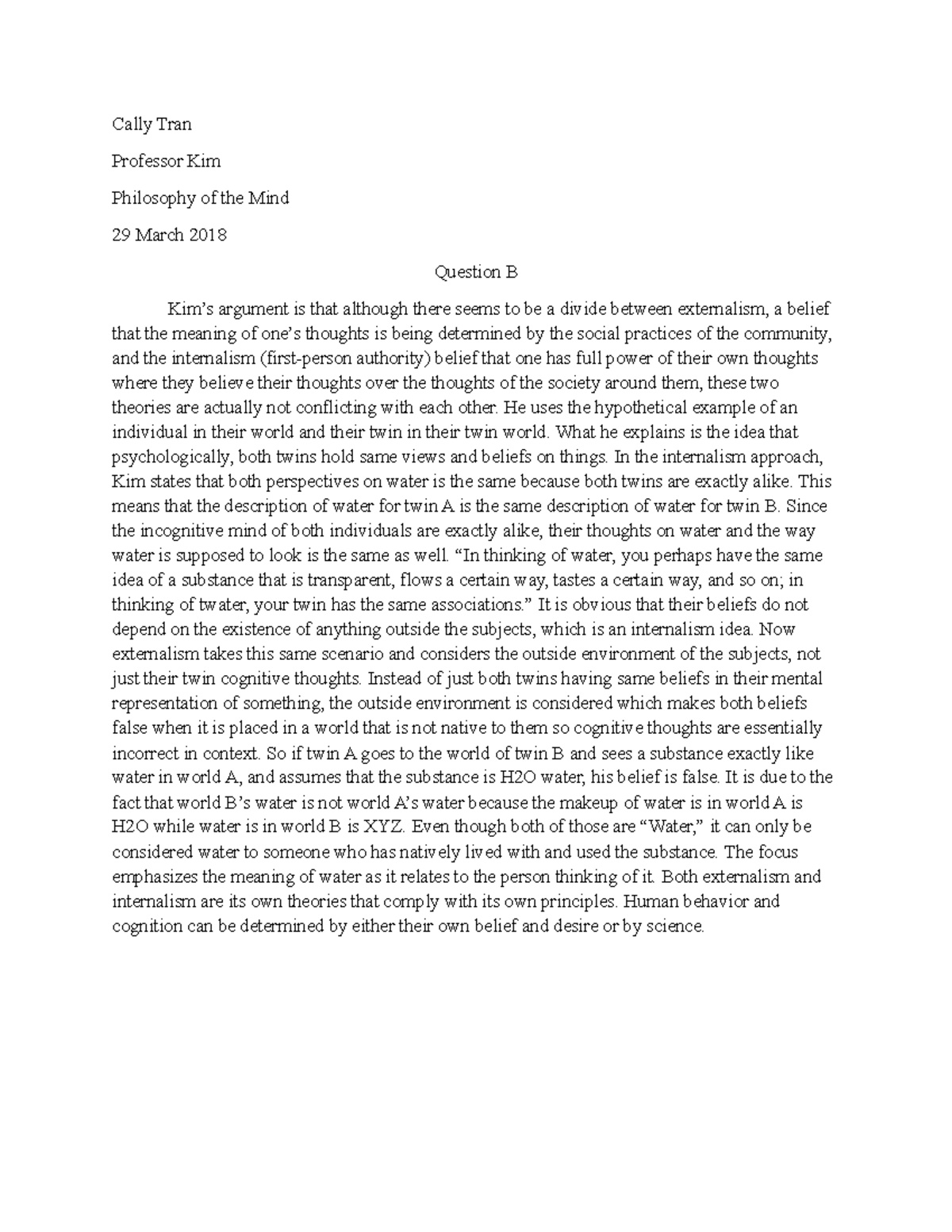 Philosophy of Mind - Externalism - Cally Tran Professor Kim Philosophy ...