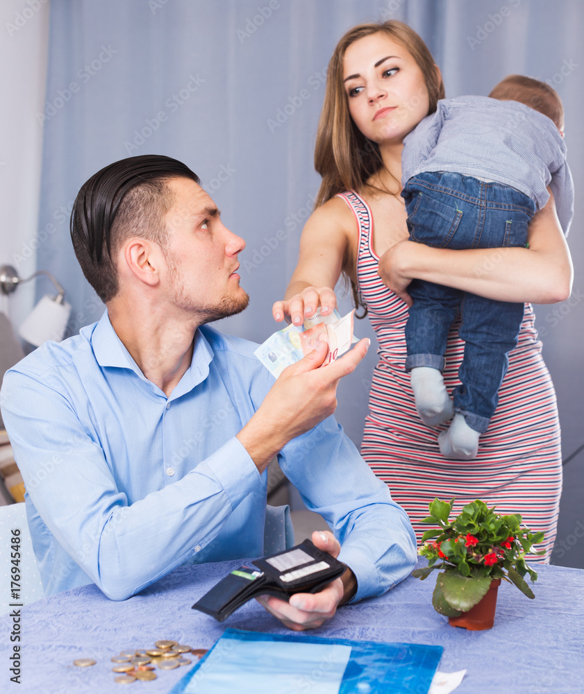 Angry female with child extorting money from male with hate indoors ...