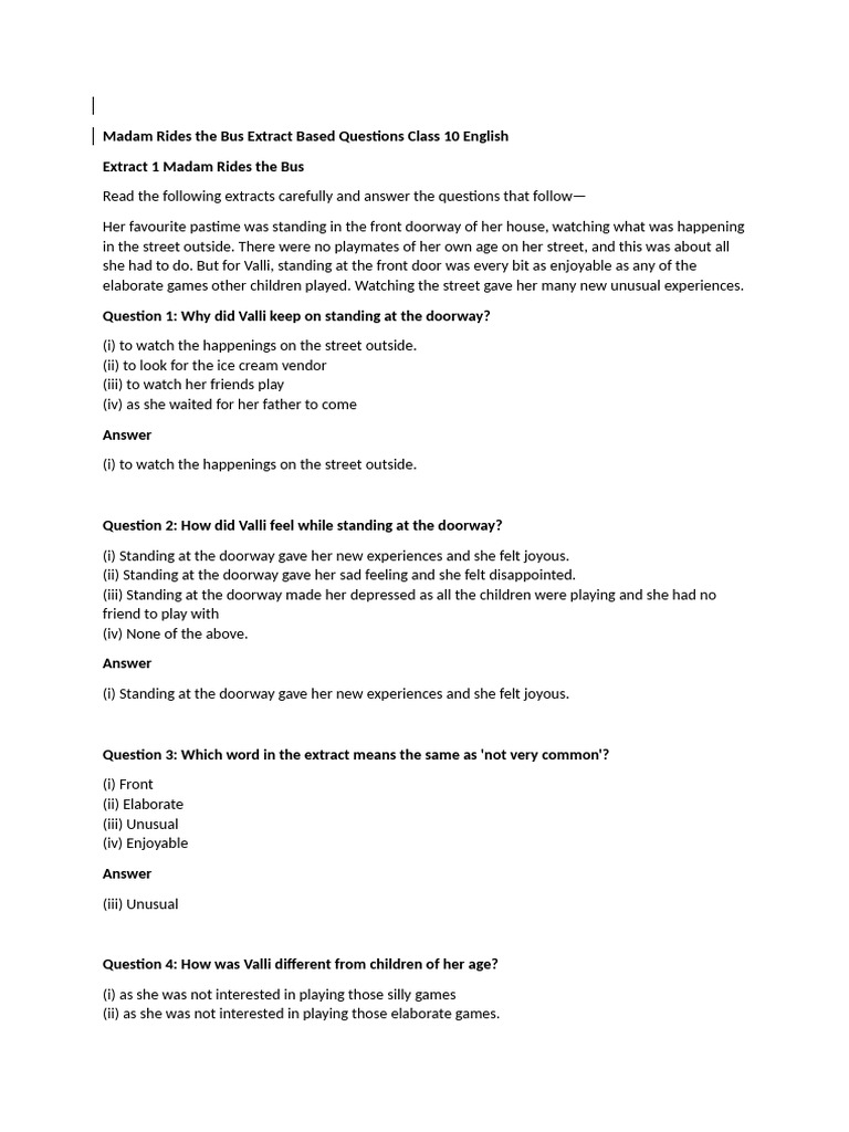Madam Rides The Bus Extract Based Questions Class 10 English | PDF