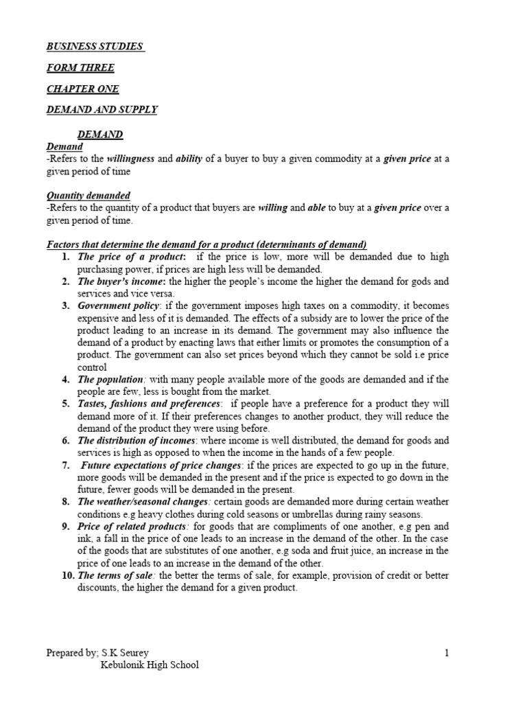 Business Studies Notes - Form 3 (F3) - Demand, Supply & Firm Size - Studocu