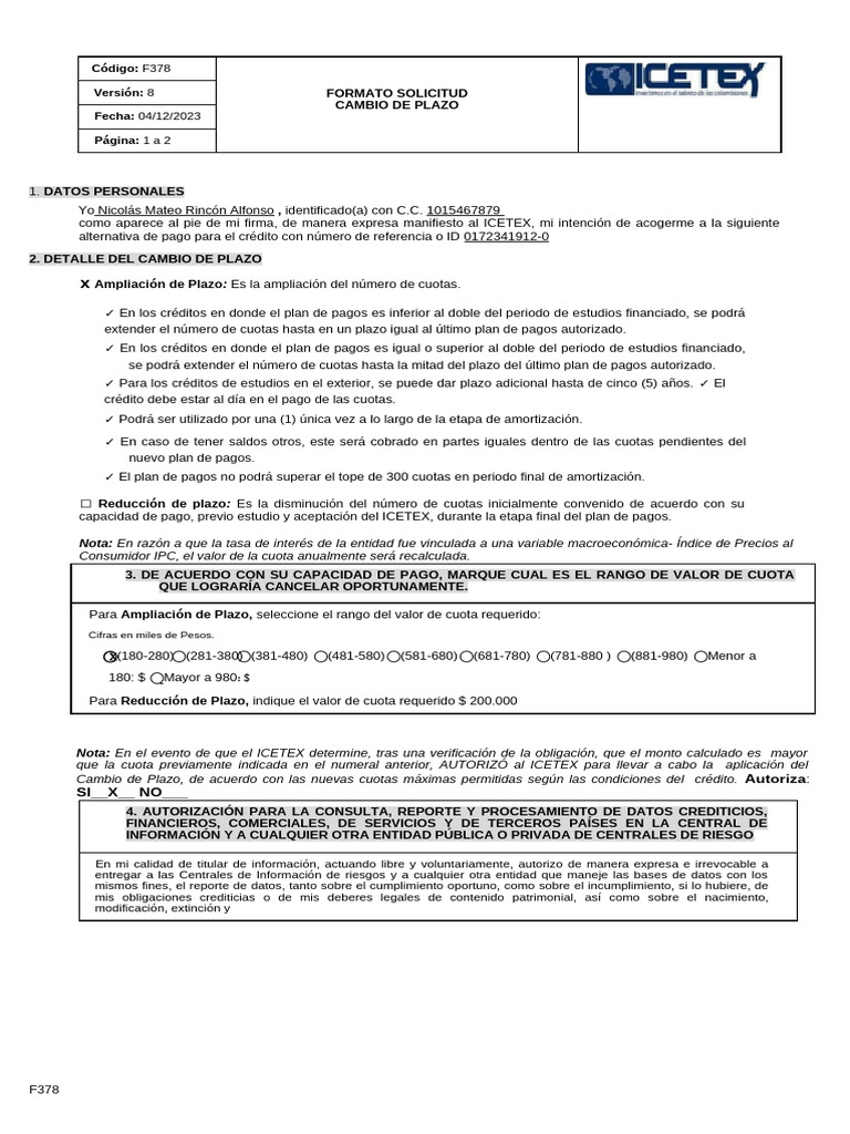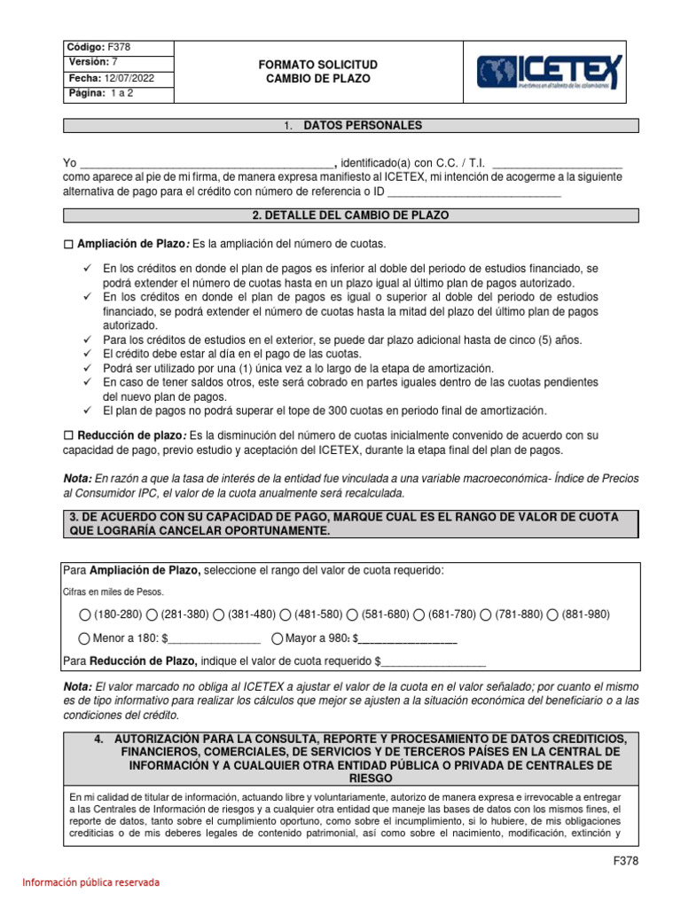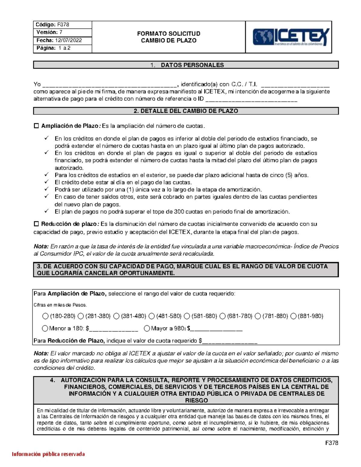 Solicitud de Cambio de Plazo - ICETEX F378 - Studocu