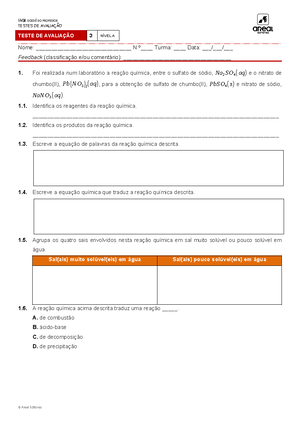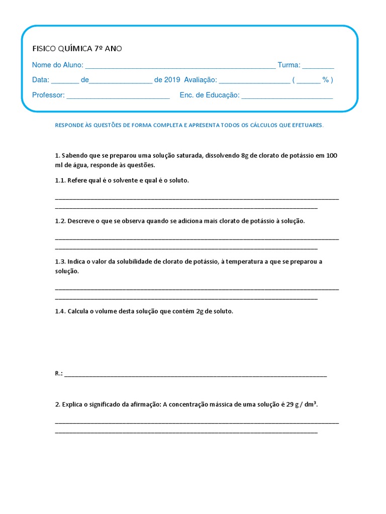 Teste de Avaliaçãon.o6 Físico-Química – 7.º ano | Notas de aula Físico ...
