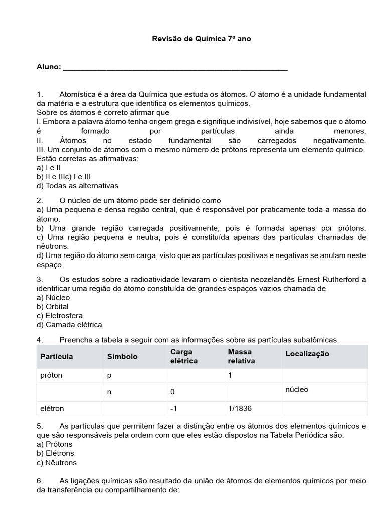 Revisão de Química 7º Ano | PDF | Próton | Fissão nuclear