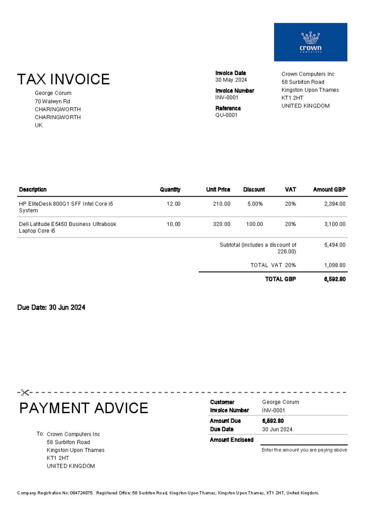 Invoice INV-0001 - sggdgfdg - PAYMENT ADVICE To: Crown Computers Inc 58 ...