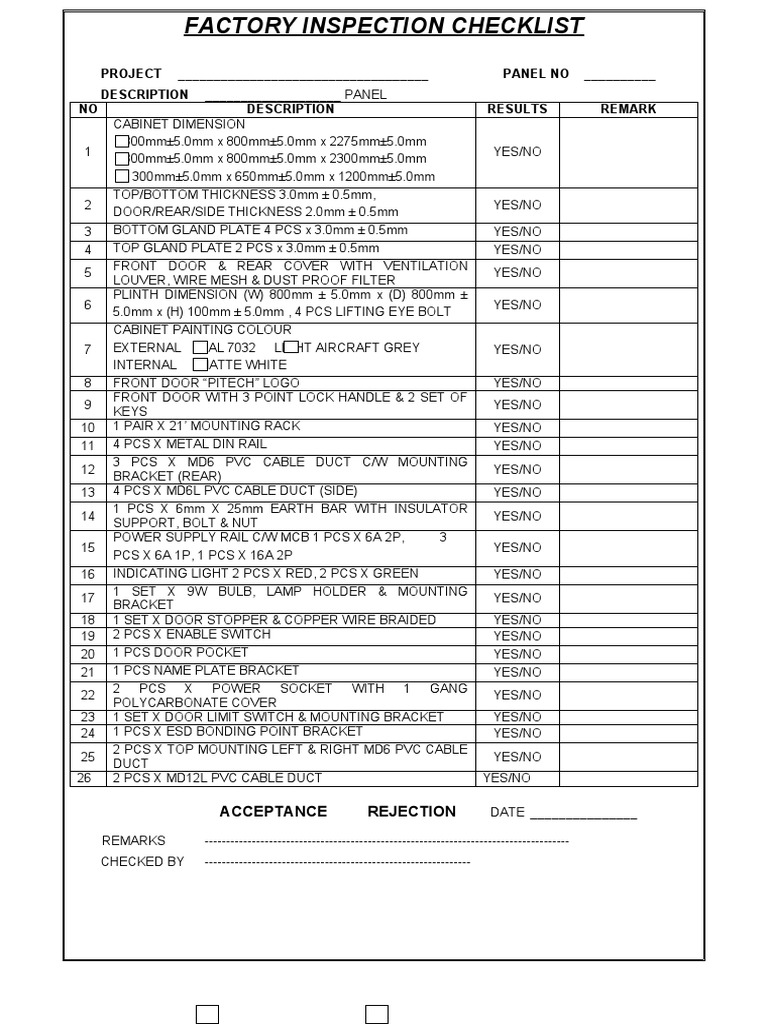 Factory Inspection Checklist Overview | PDF | Door | Equipment