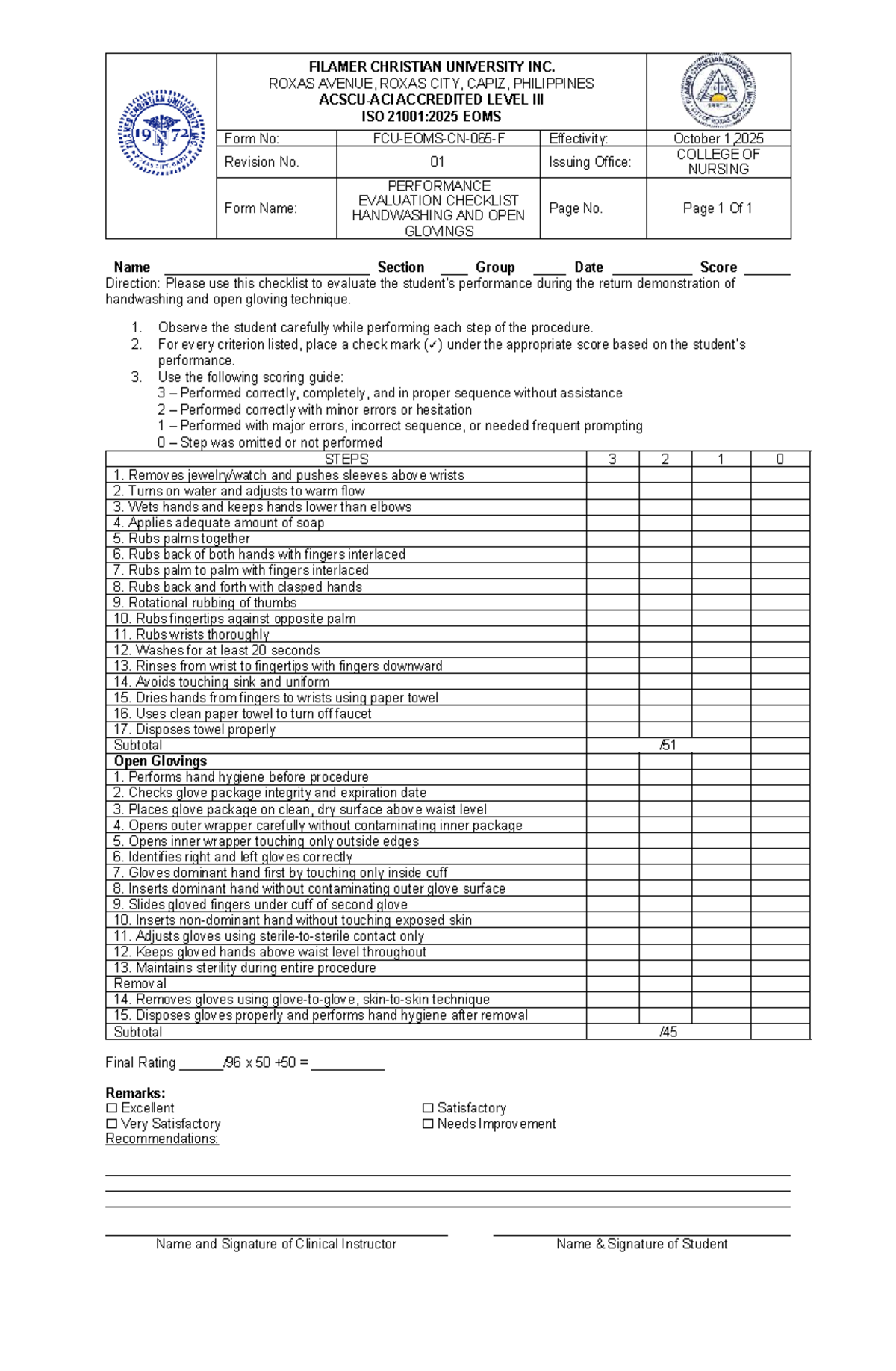 FCU CN 065 F Performance Eval Checklist: Handwashing & Gloving - Studocu