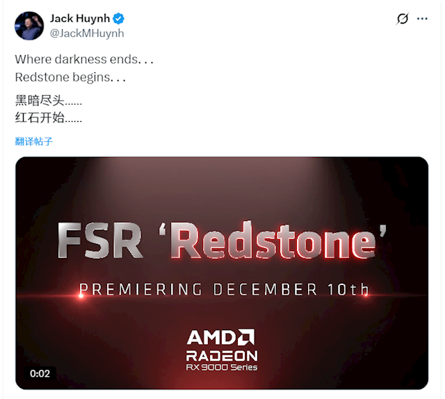 AMD官宣:FSR Redstone重磅升级12月10日发布!