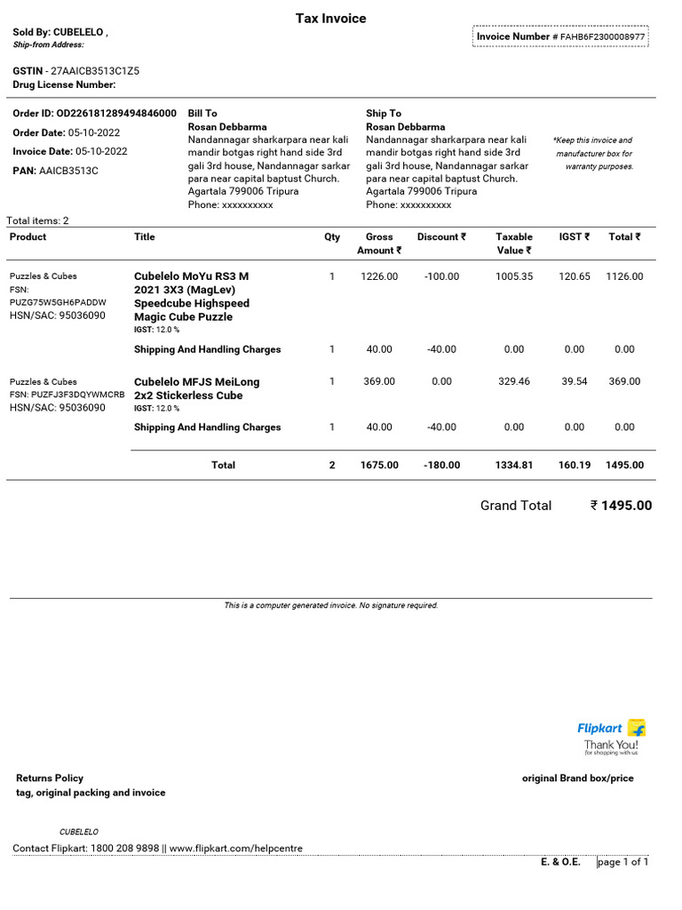 Invoice for Cubelelo Puzzles Purchase | PDF | Taxation | Payments