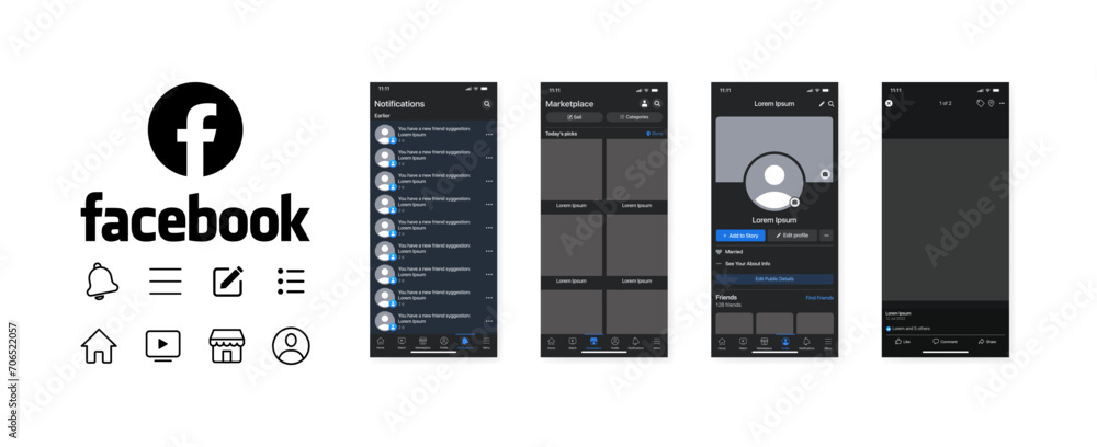 Facebook interface template. Social media black buttons. Facebook ...