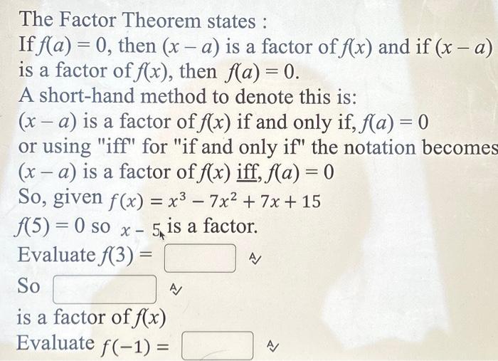 Solved The Factor Theorem states : If f(a) = 0, then (x-a) | Chegg.com