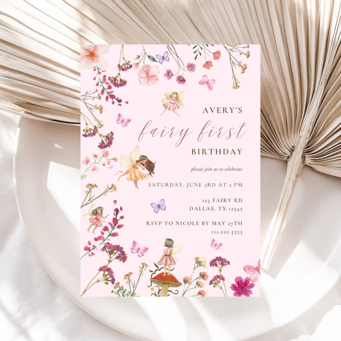 Editable Fairy 1st Birthday Invitation Enchanted Fairy Blush Pink Boho ...