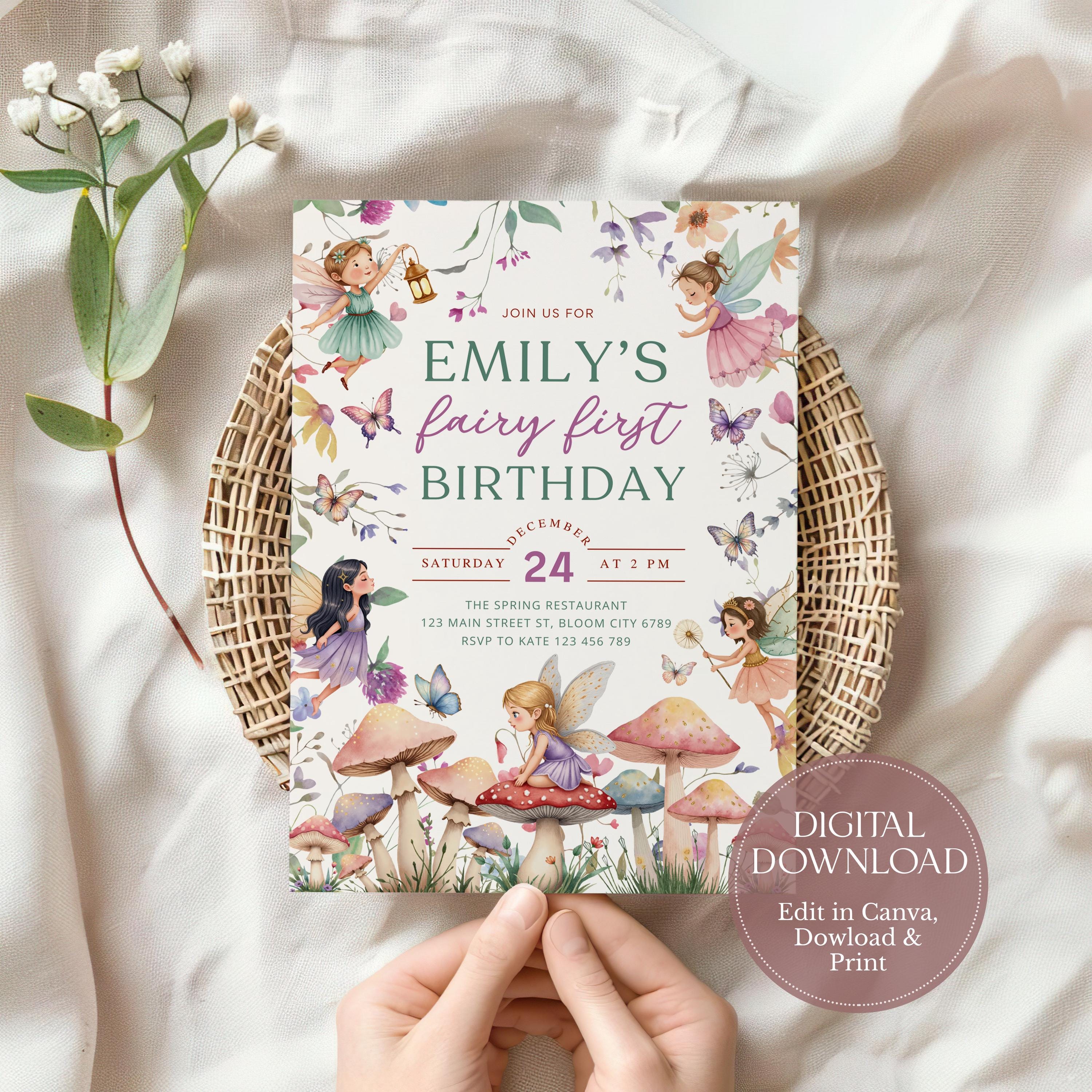 Fairy 1st Birthday Invitation Editable, Baby Girl First Party Enchanted ...