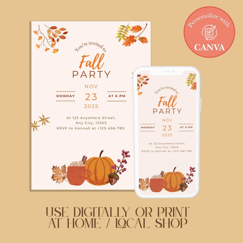 Fall Leaves Party Invitation Canva Template Printable Fall Invitation ...