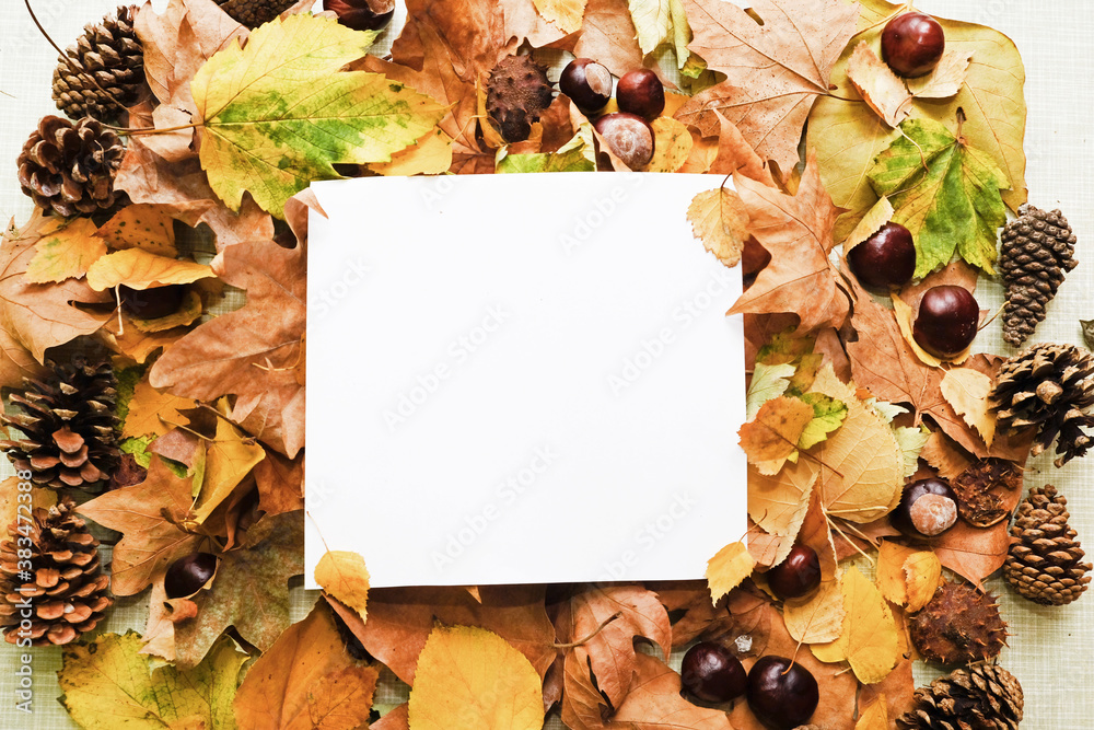 autumn leaves frame for white paper card decorated with chestnuts and ...