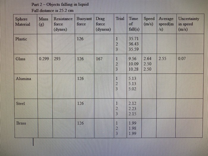 Solved Part 2 - Objects falling in liquid Fall distance is | Chegg.com