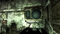 A screenshot from Fallout 3: Blood on a projector in an abandoned Vault ...