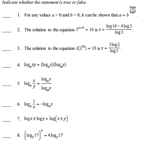 Properties of Logarithmic Functions - True or False Test Practice ...