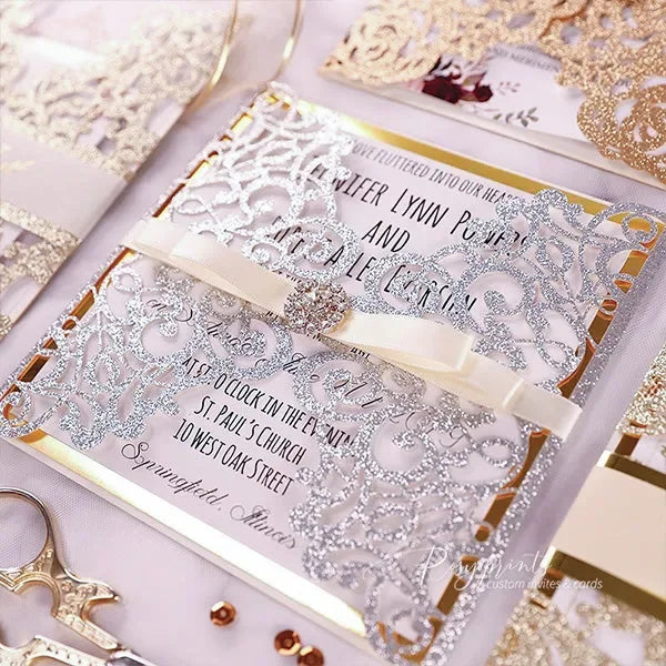 Elegant glitter laser cut silver invitation with wrap band, jewel and ...