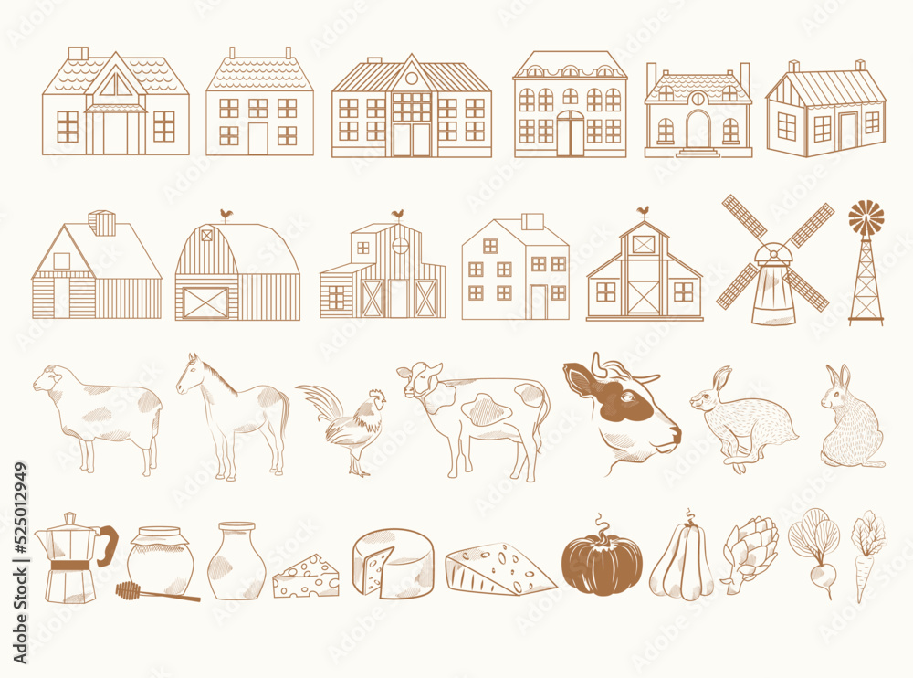 Collection of farm elements linear symbols, icons design. Farm animals ...