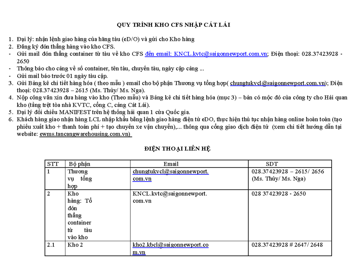 Quy Trình Nhập Kho CFS Tại Cát Lái - Hướng Dẫn Chi Tiết - Studocu