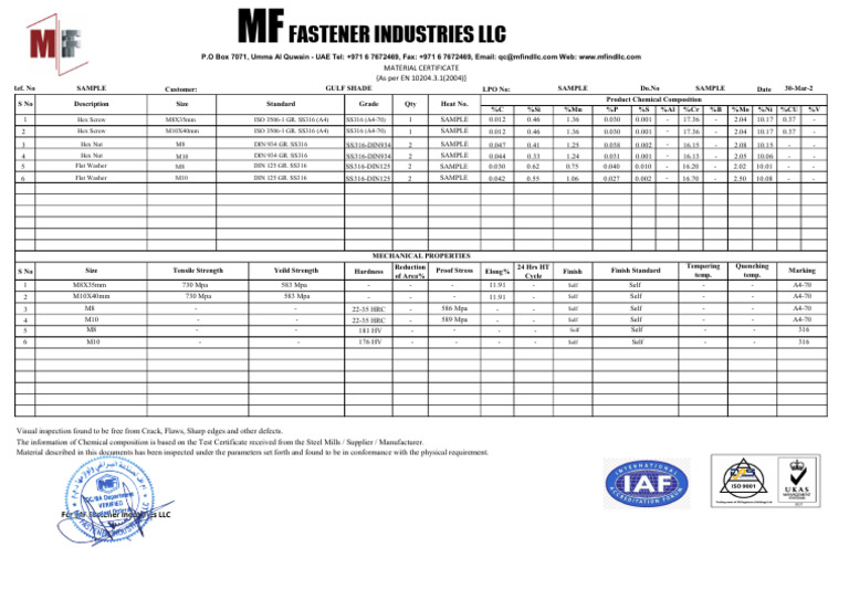 Material Test Certificate for Fasteners and Fittings Detailing Chemical ...