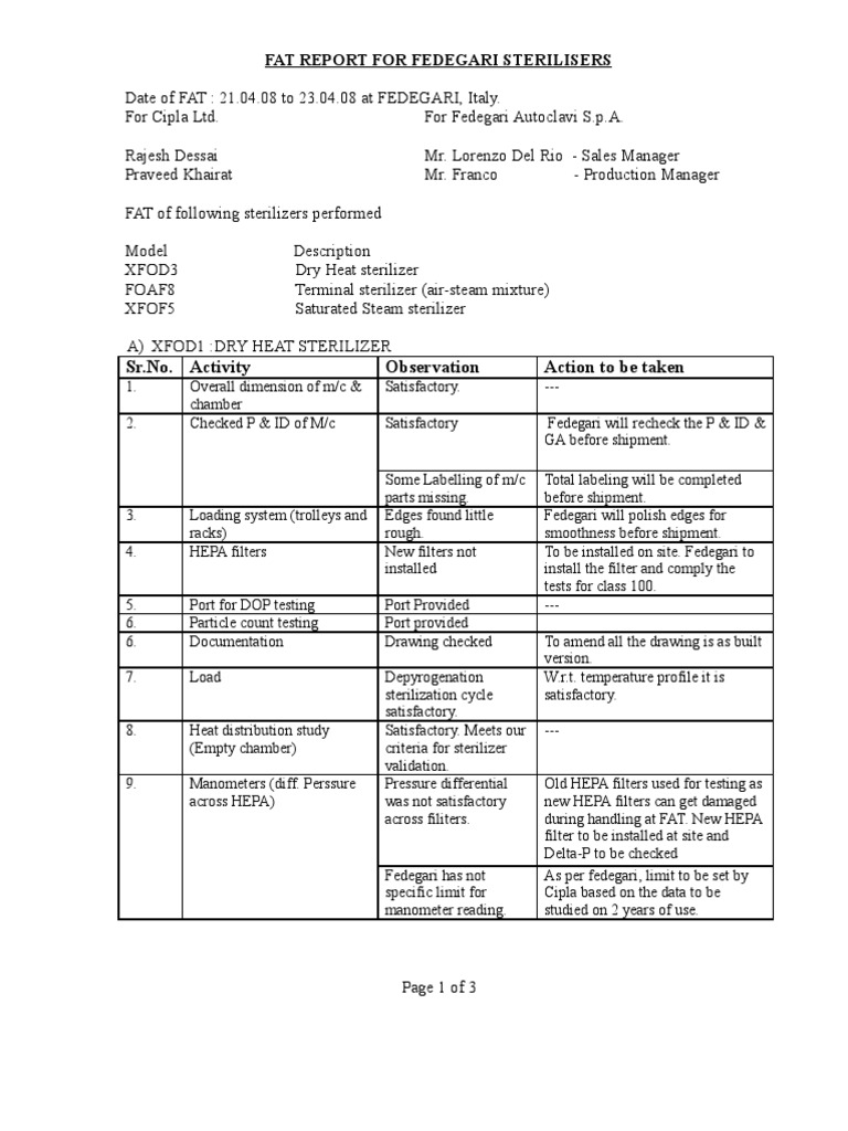 Fedegari Sterilizer FAT Report | PDF | Valve | Calibration