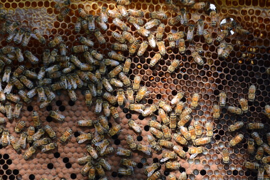 Bees On The Honeycomb With The Brood Of The Queen Bee Stock Photo ...
