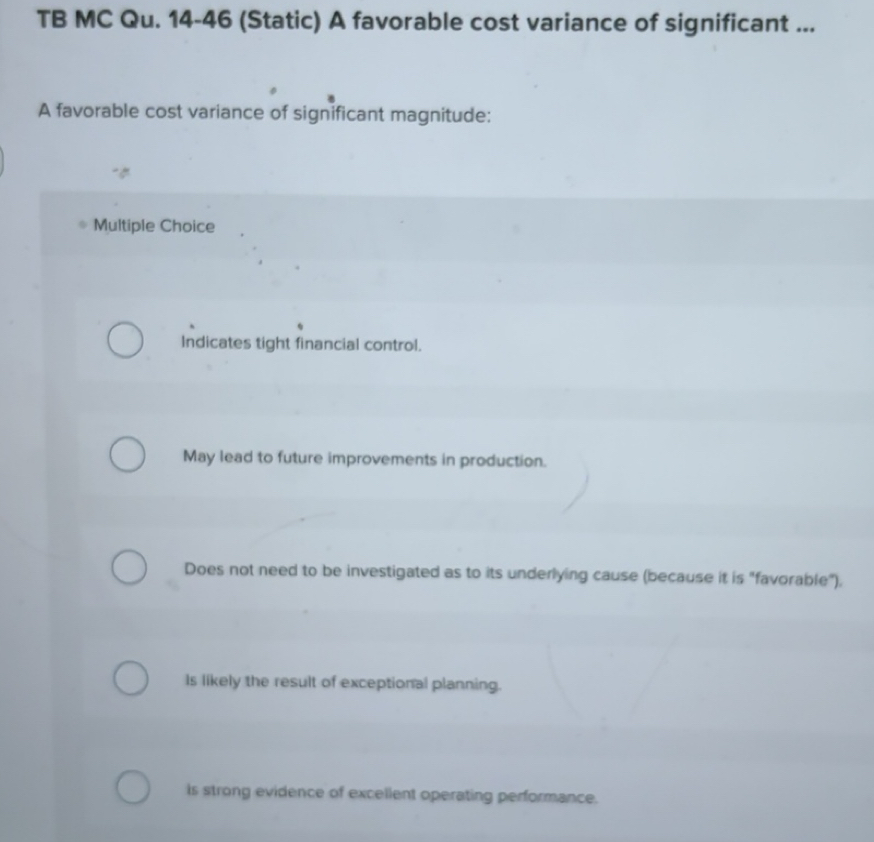 Solved: TB MC Qu. 14-46 (Static) A favorable cost variance of ...