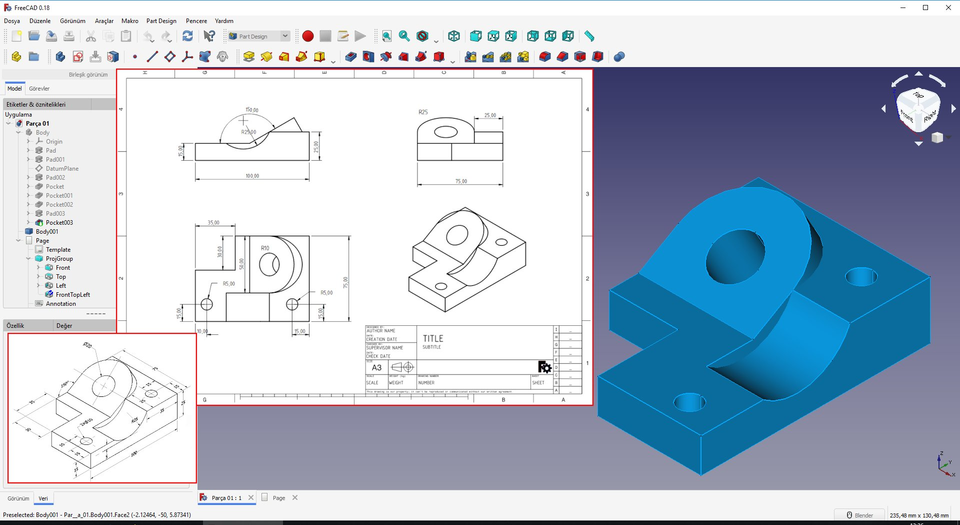 FreeCAD view of the objects present in the "drawing.FCStd" file, and ...