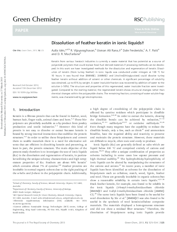 Dissolution of feather keratin in ionic liquids - Green Chemistry (RSC ...