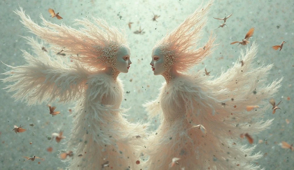 A dance of floating masks dissolving into birds, brush-stroke feathers ...