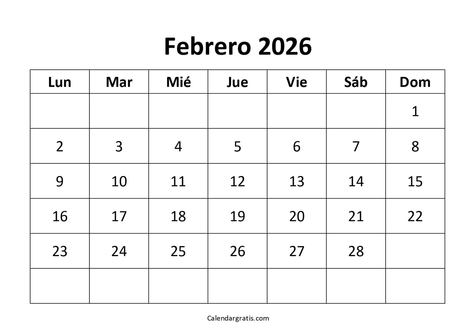 calendario febrero 2026 para imprimir gratis