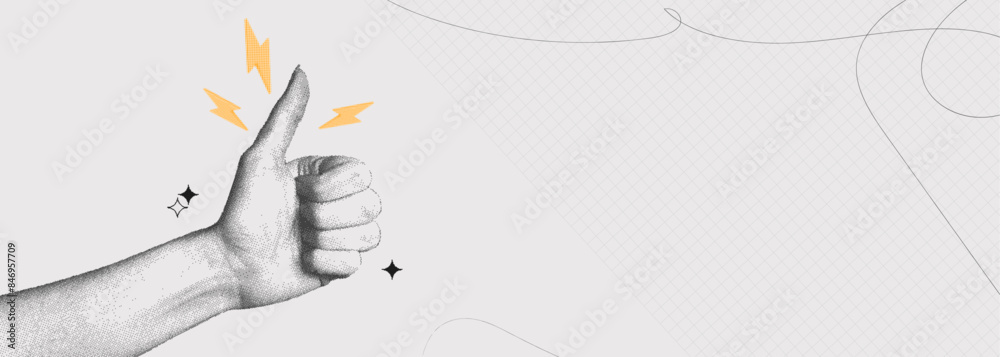 Trendy Halftone Collage banner hand showing thumbs up gesture. Ok sign ...