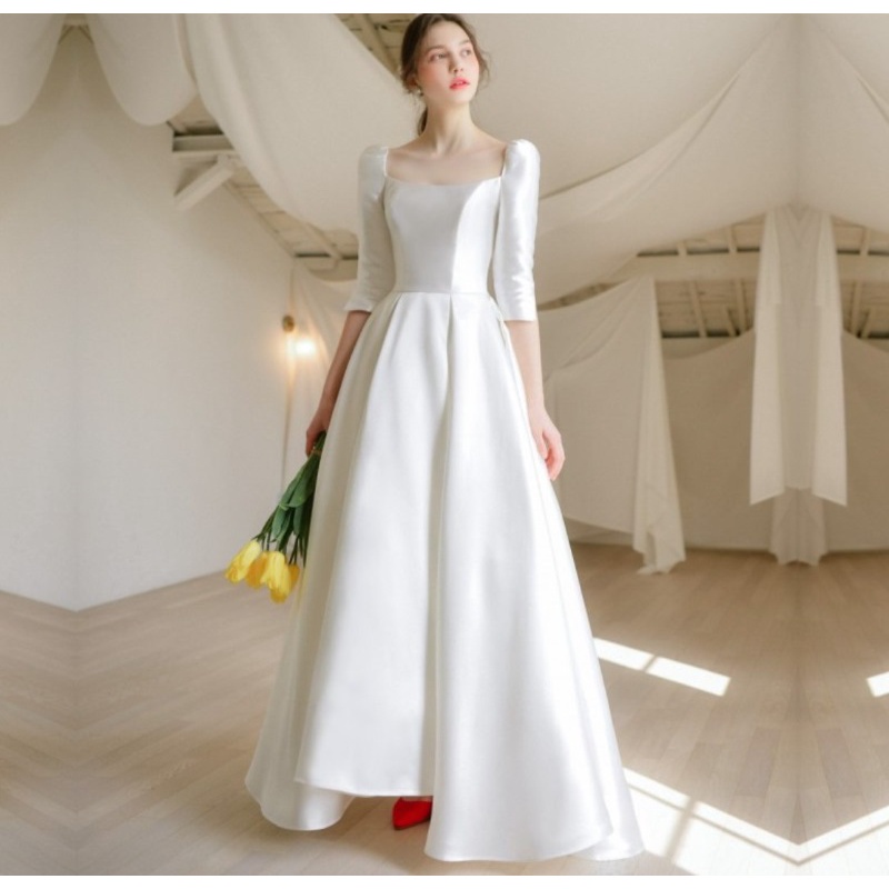 YLFF-Brides Simple A-Line Square Neck Satin Vintage Half Sleeve ...