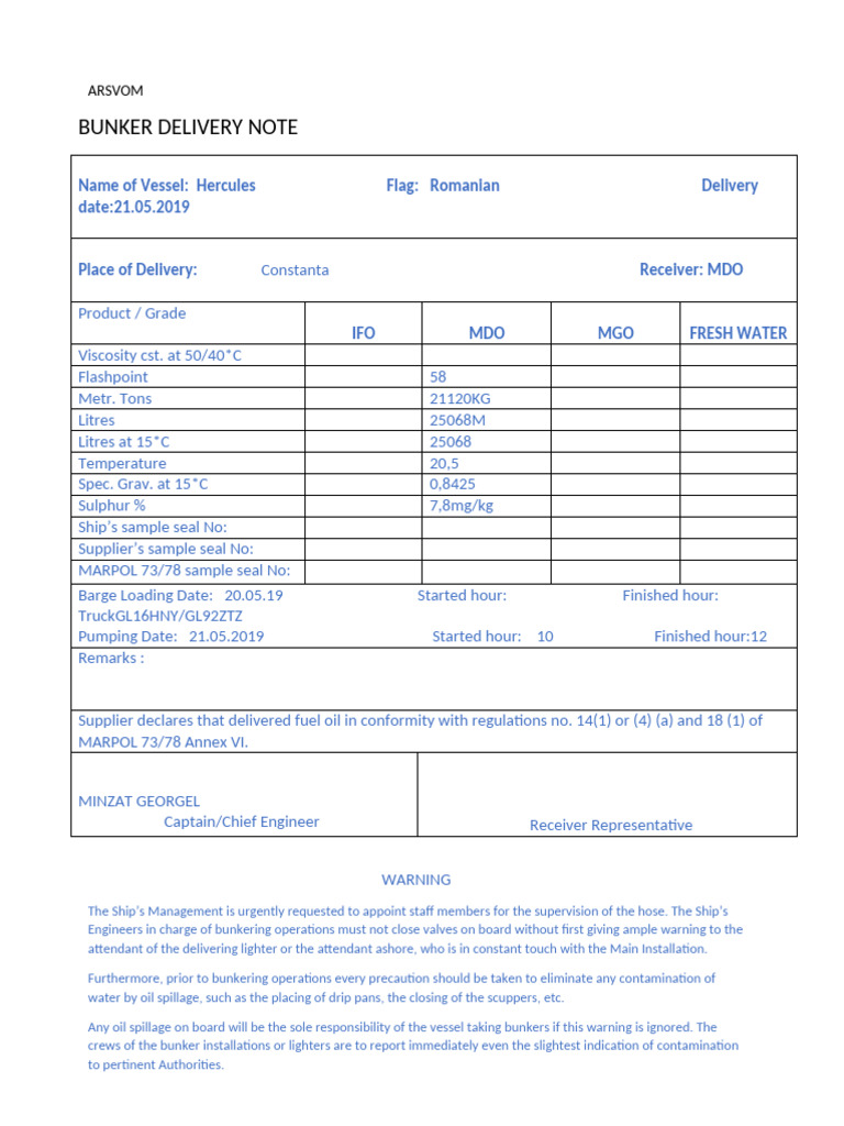 Bunker Delivery Note for Hercules Vessel | PDF
