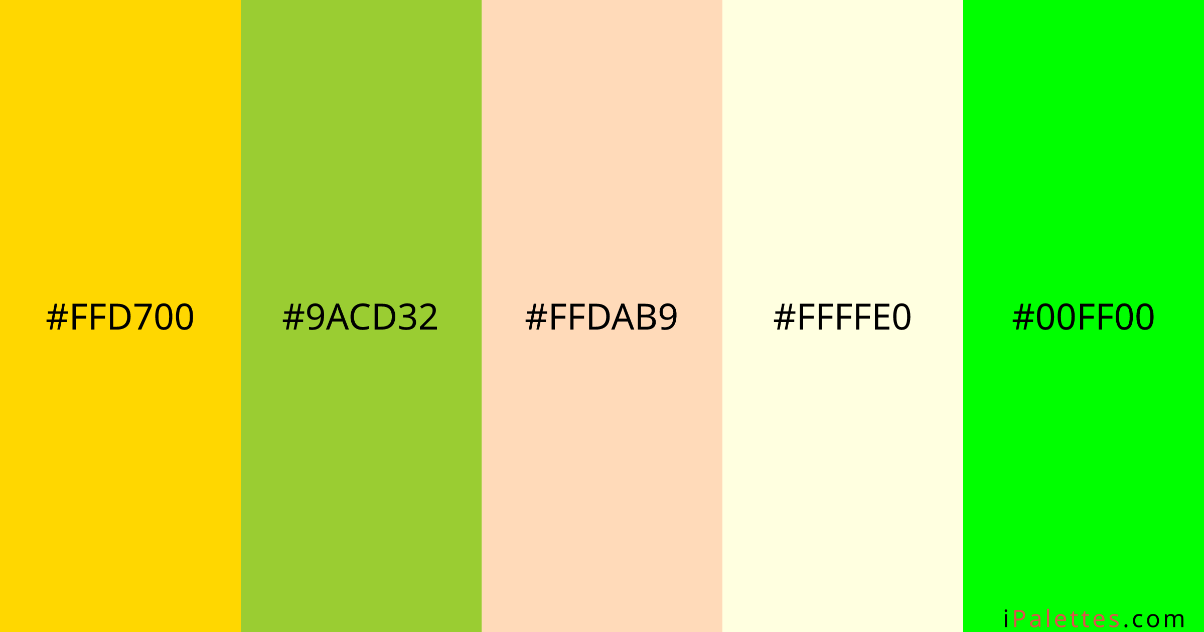 Happy Color Palette and colors #ffd700 #9acd32 #ffdab9 #ffffe0 #00ff00 ...