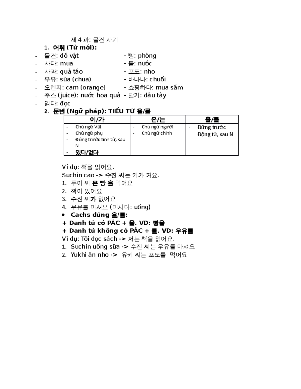 19 12 - ffffffffff - 제 4 과: 물건 사기 1. 어휘 (Từ mới): - 물건: đồ vật - 빵 ...
