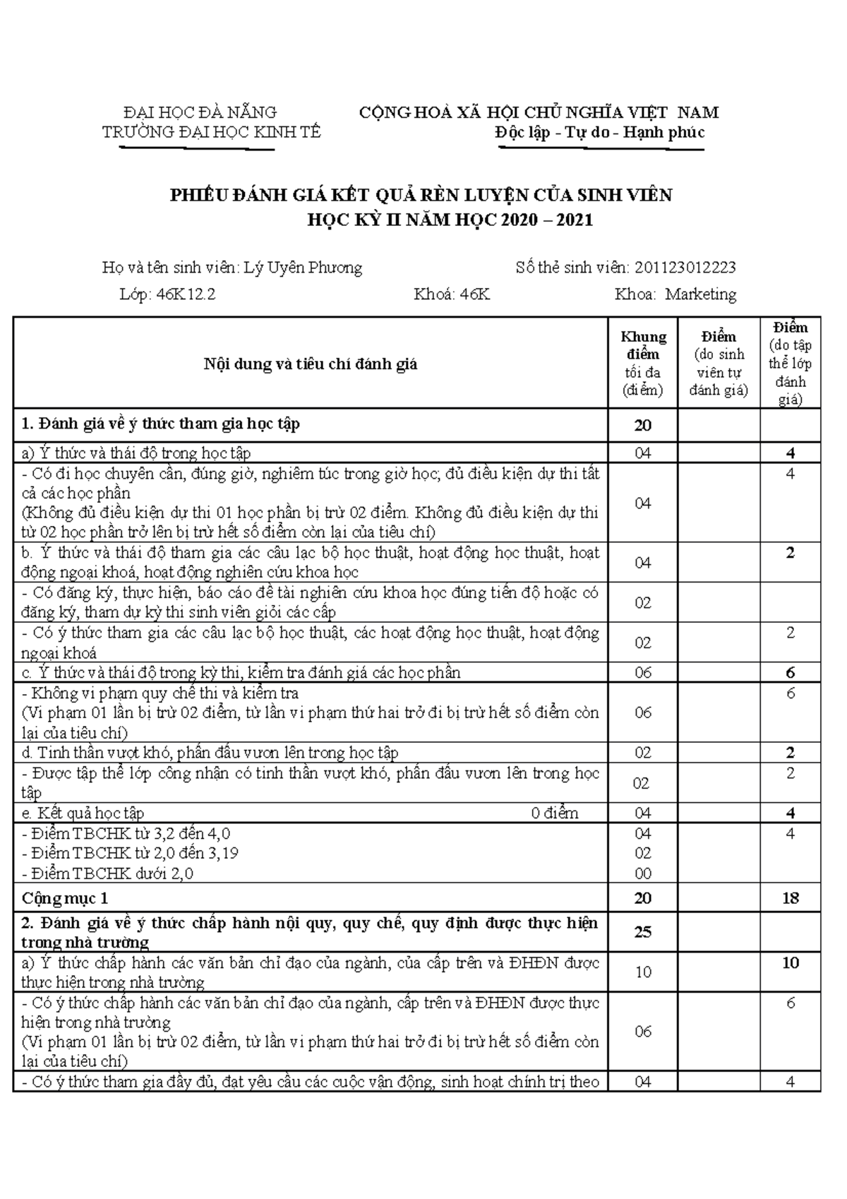 Mẫu chấm ĐRL - fffffffffff - ĐẠI HỌC ĐÀ NẴNG CỘNG HOÀ XÃ HỘI CHỦ NGHĨA ...