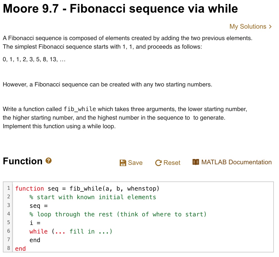 SOLVED: DO USING MATLAB PLEASE, (USE A WHILE LOOP). Moore 9.7 Fibonacci ...