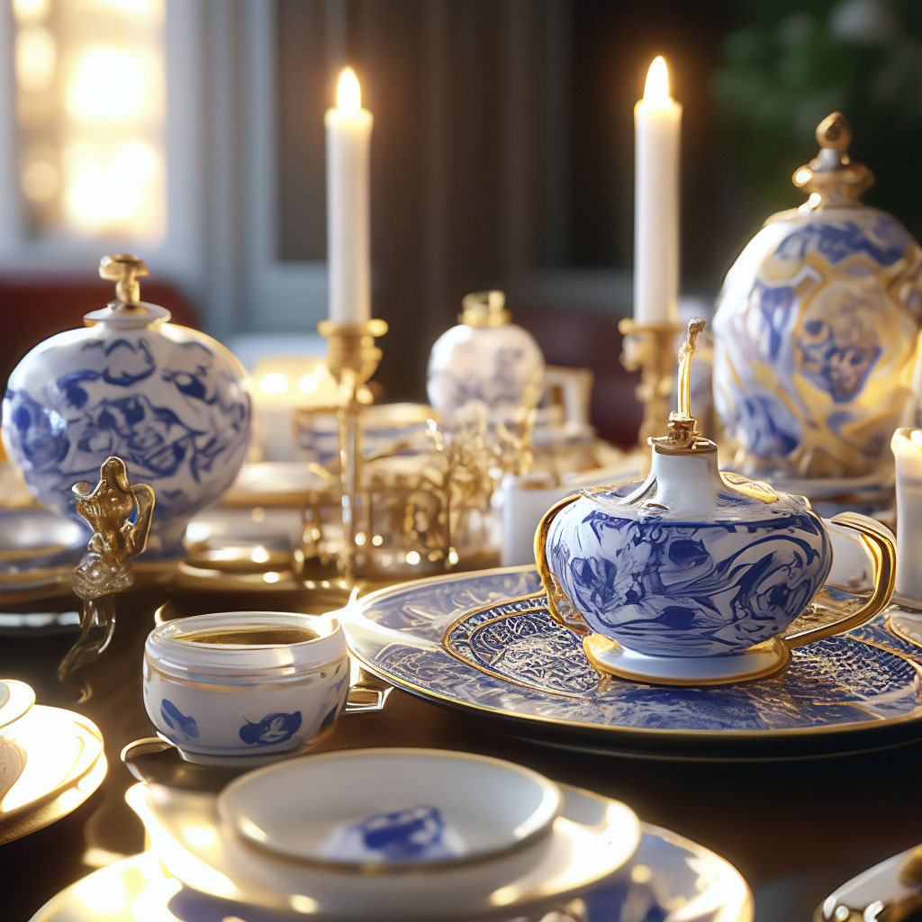 "Festively set table, porcelain tableware, soft light, filigree ...