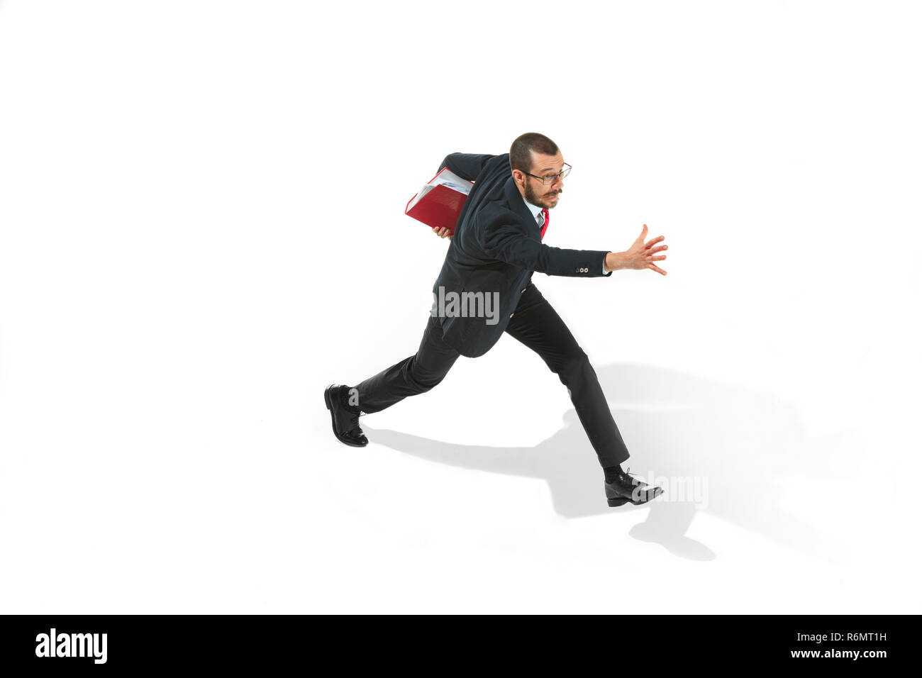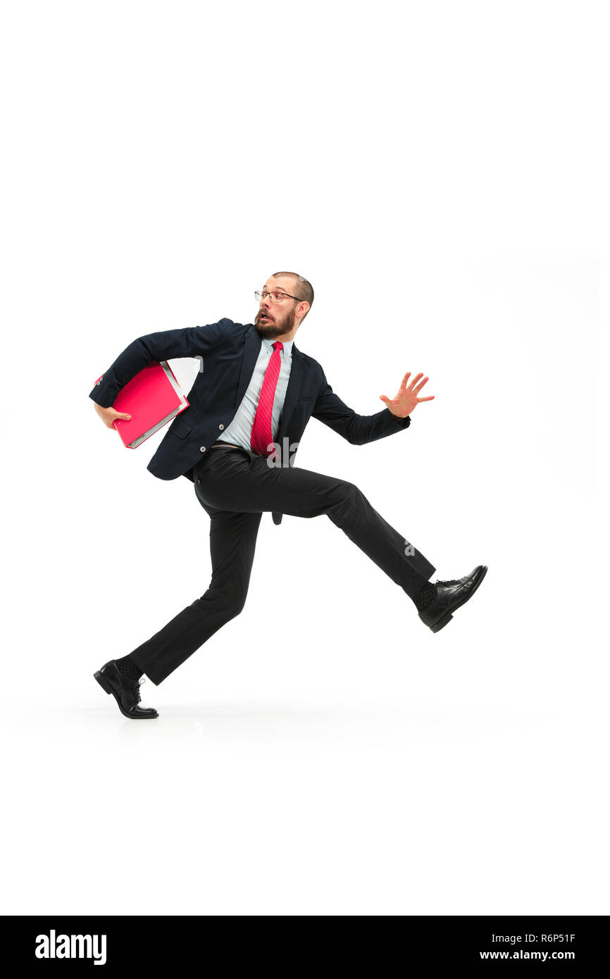 Businessman running with a folder on white background Stock Photo - Alamy