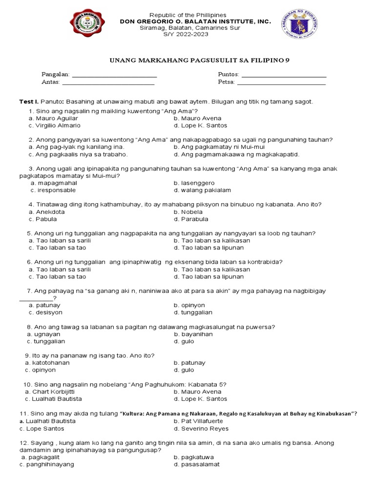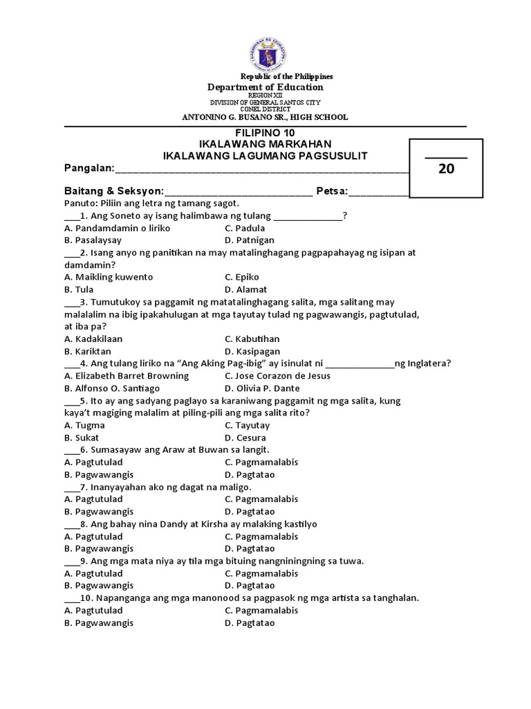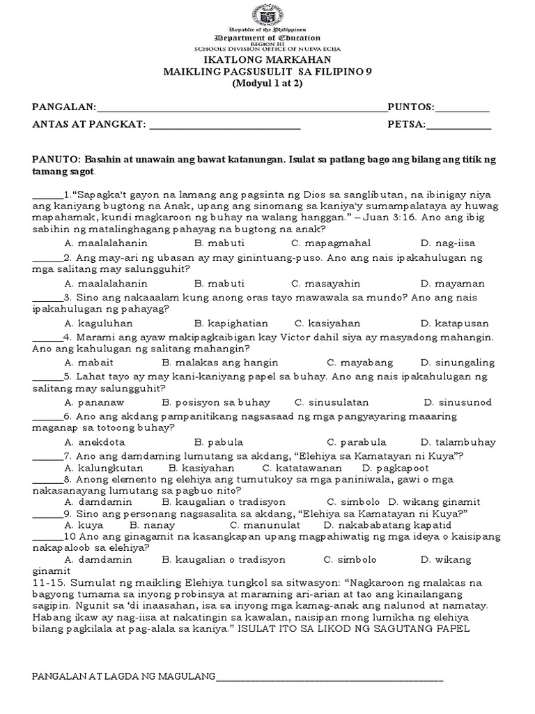 Halimbawa ng Pagsusulit sa Filipino 9 Mga halimbawa ng pagsusulit sa ...