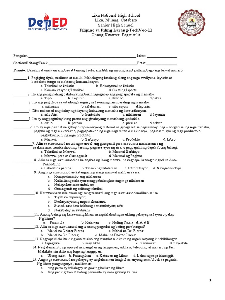 Unang Markahang Pagsusulit Sa Filipino Sa Piling Larang (1) Rebecca