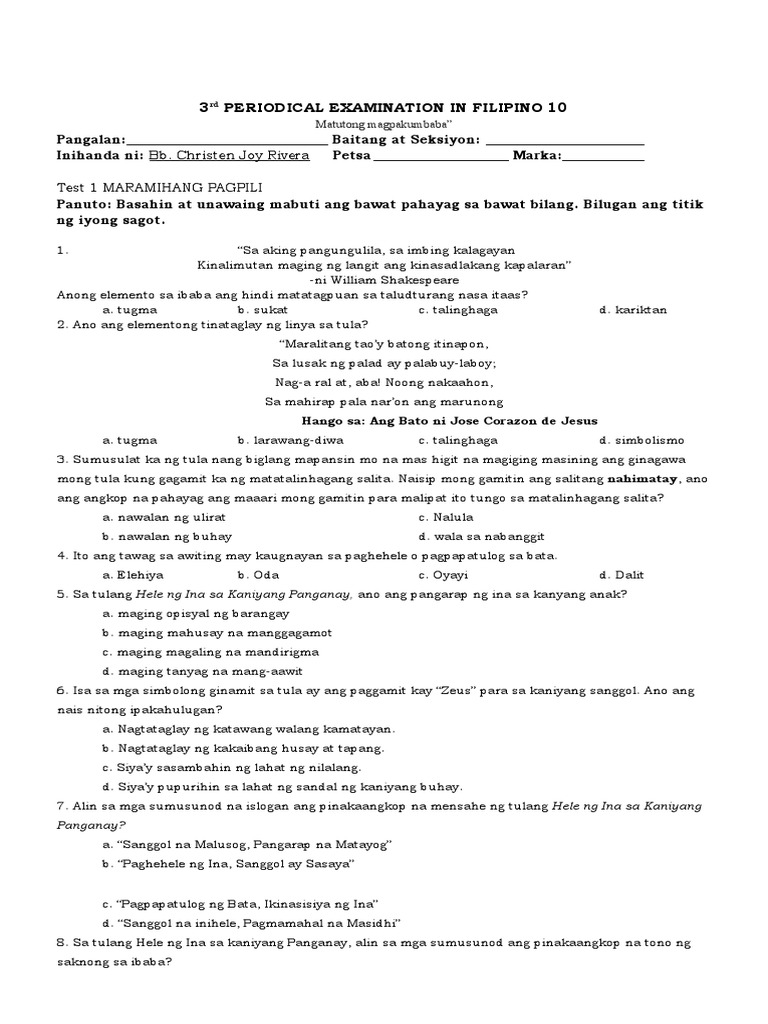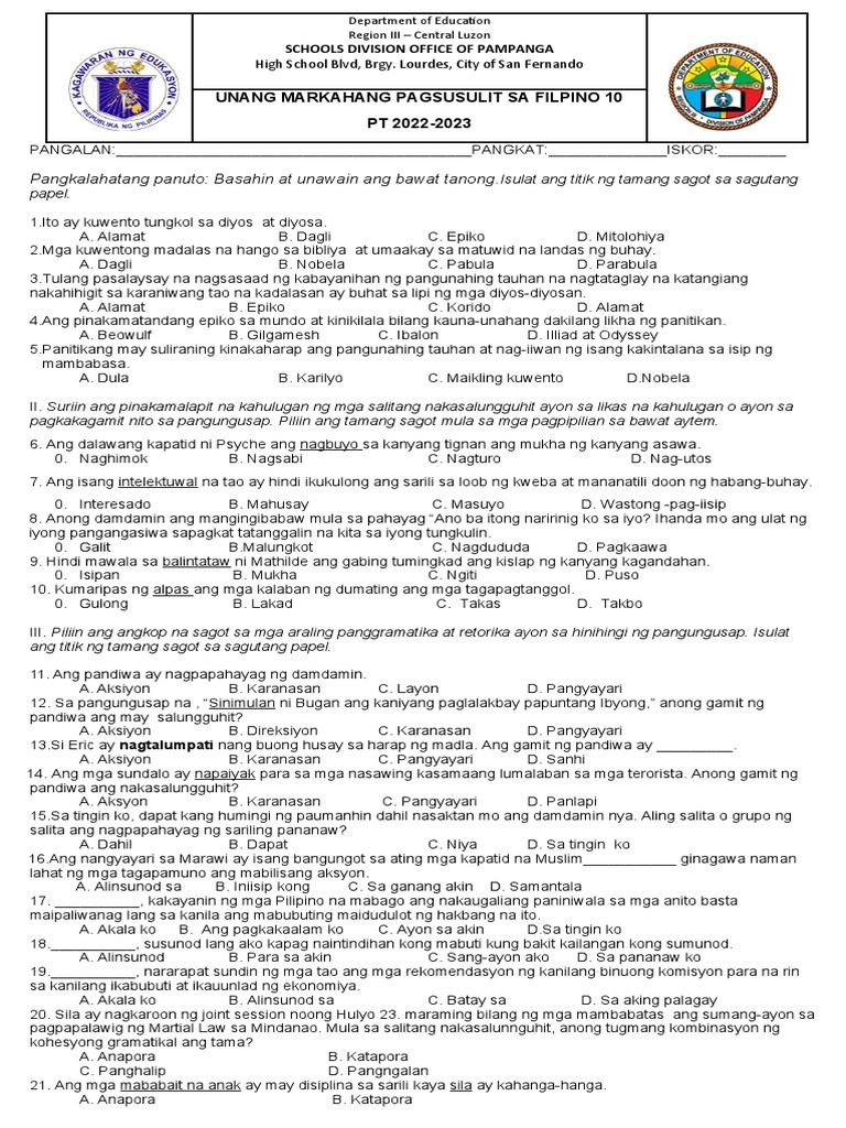 Unang Markahang Pagsusulit SA Filipino 10 - UNANG MARKAHANG PAGSUSULIT ...