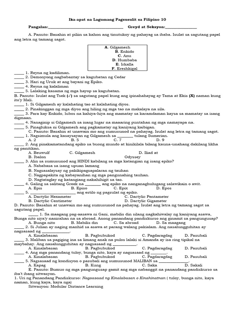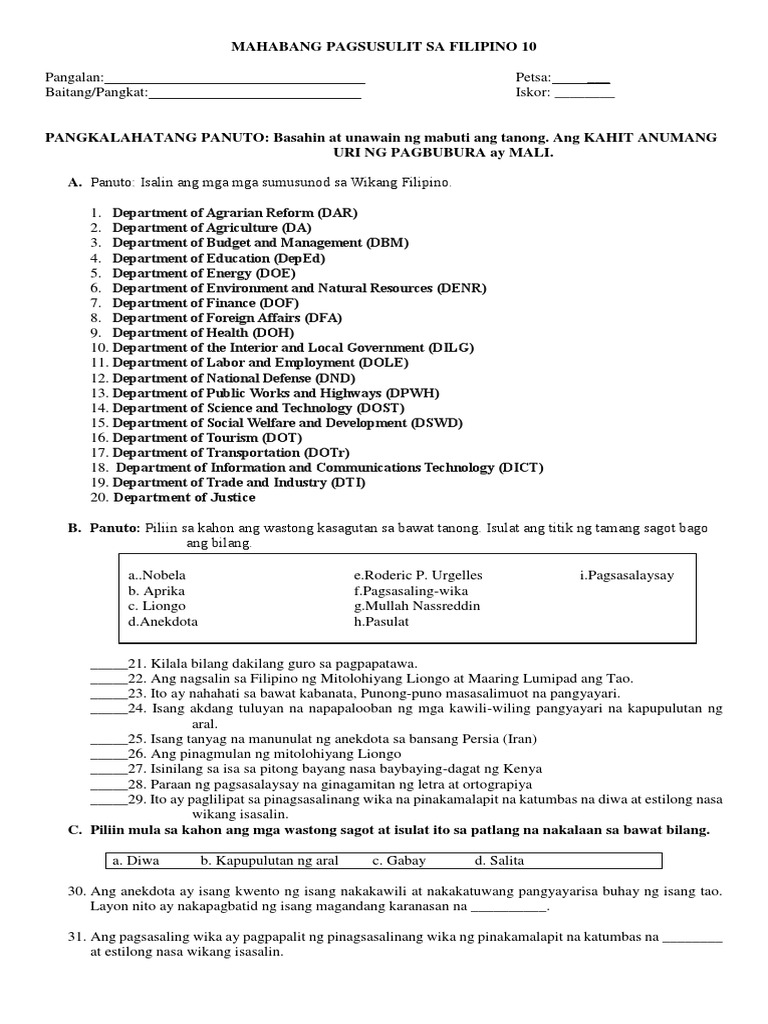 Mahabang Pagsusulit Sa Filipino 10