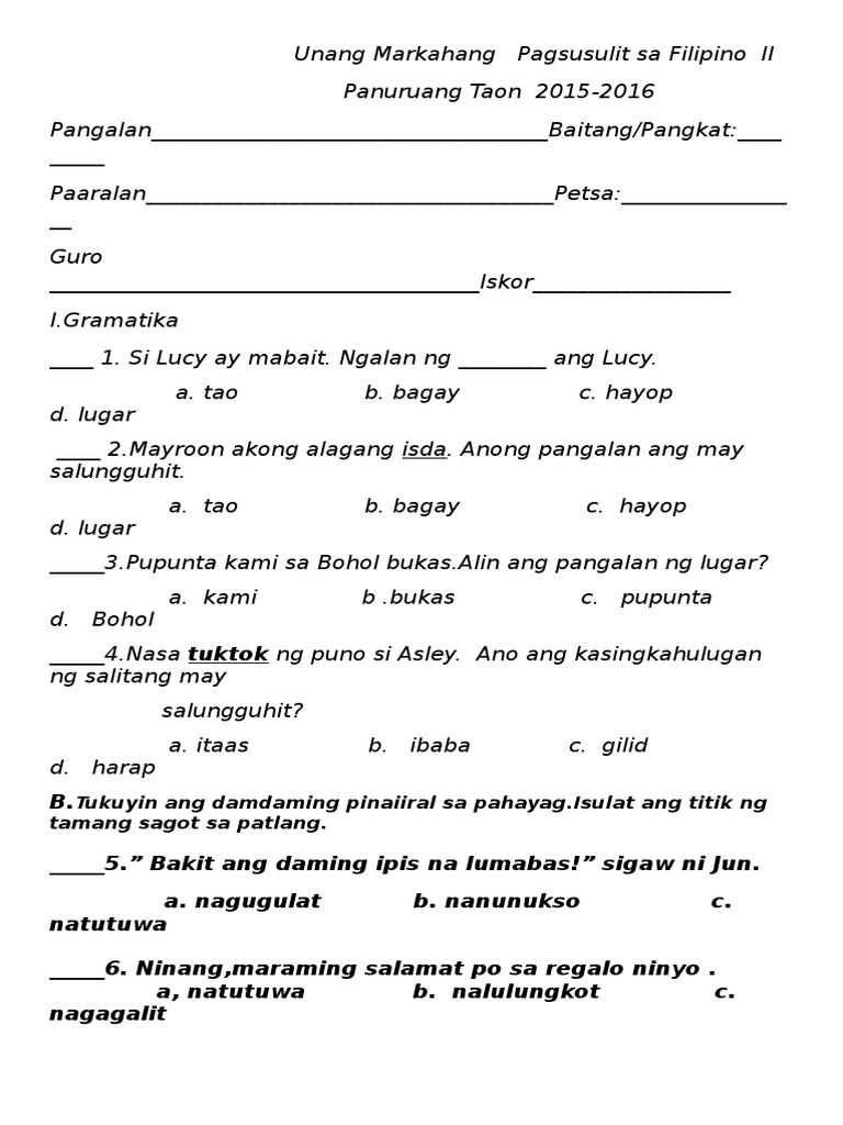 Unang Markahang Pagsusulit Sa Filipino II 2015-2016 | PDF